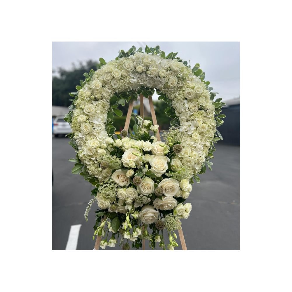 A soft and elegant cross arrangement featuring cream roses, white hydrangeas and delicate spray roses.